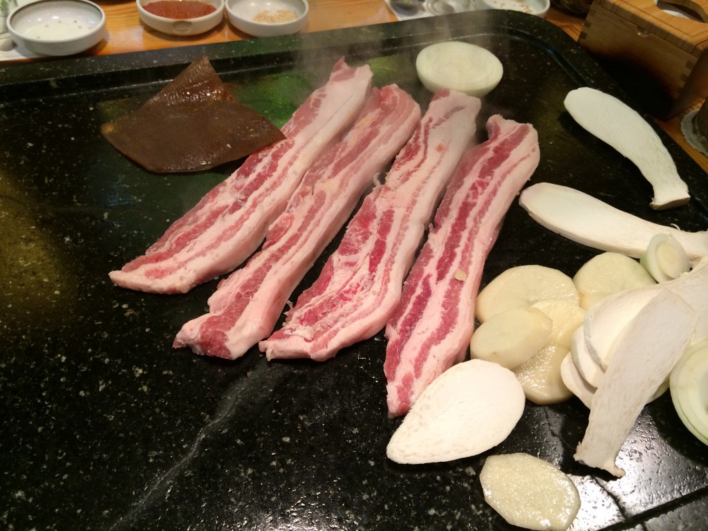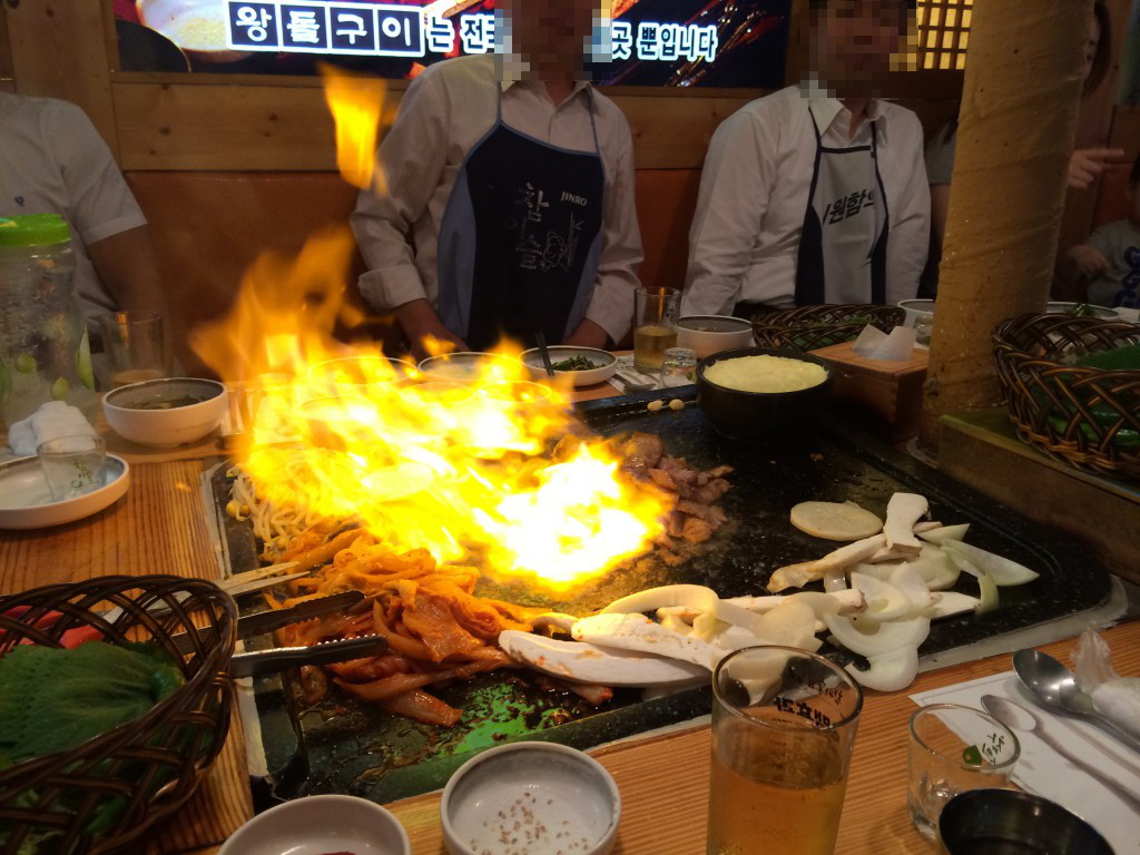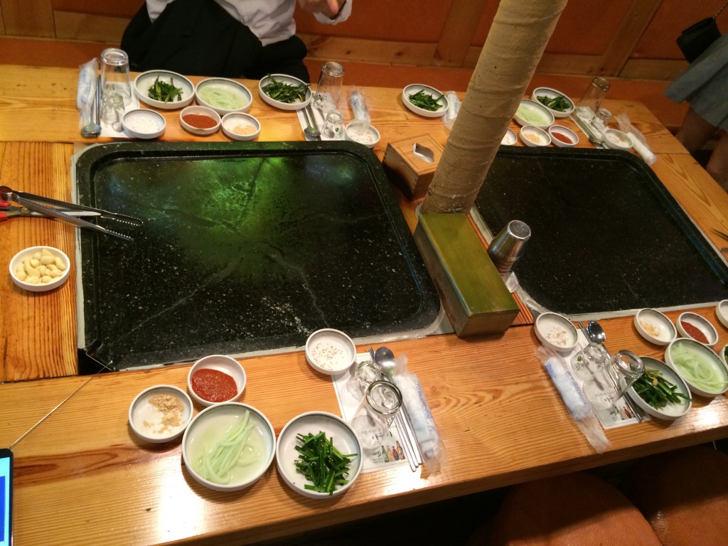 예약을 해 둔 2층에 올라가니... 미리 돌판이 덥혀져 있습니다. 넓직한 돌판만 봐도 뭔가 다른 집인 것이 좀 느껴 집니다.