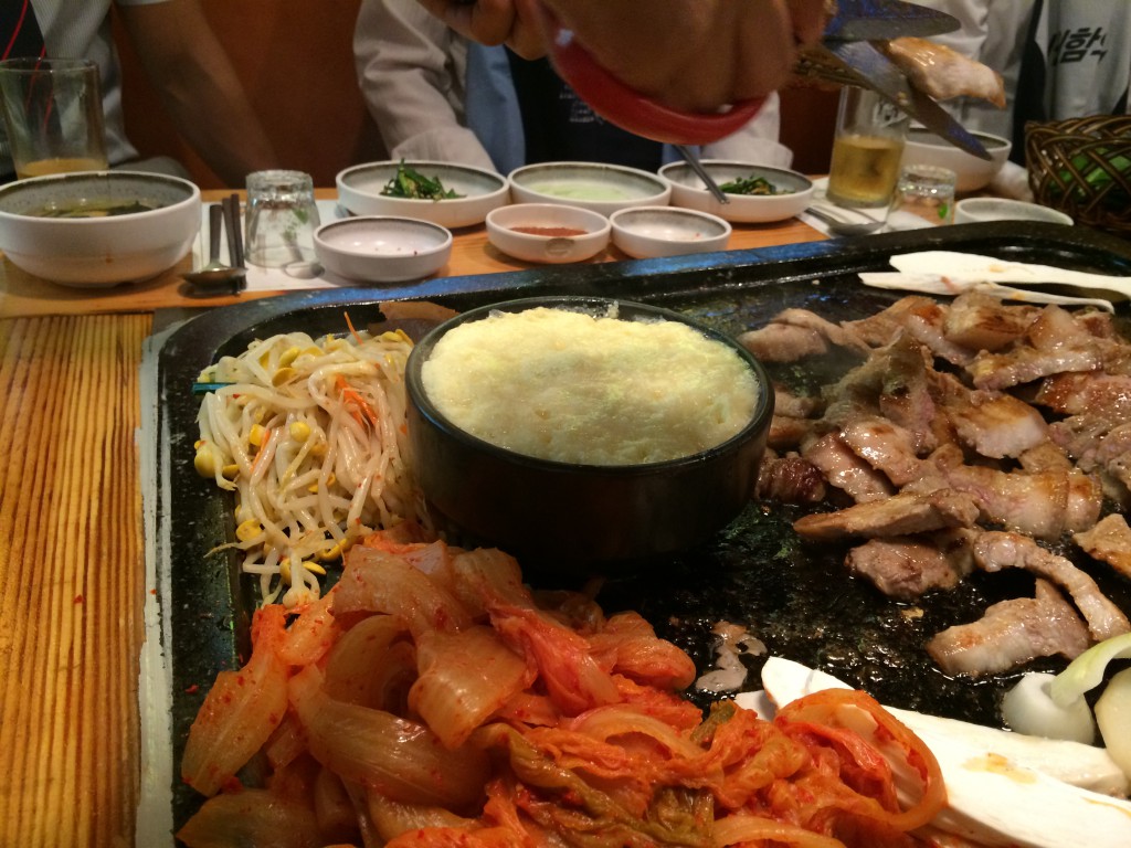 단점이라면 고기를 한번에 다 익혀 먹기 때문에 나중에 먹는 고기는 좀 너무 익는다 싶게 익습니다. 마지막에는 돼지고기를 너무 익히면 나는 냄새도 약간 돌구요. 하지만 도착 인원수 보다 살짝 적게 시키고 다시 시키는 전략으로 먹는다면 충분히 맛나게 먹을 수 있을 것도 같군요....김치, 콩나물, 감자와 같이 먹기 때문에 고기양도 적당합니다. 고기도 두꺼워서 1인당 1인분이면 많은 편입니다.