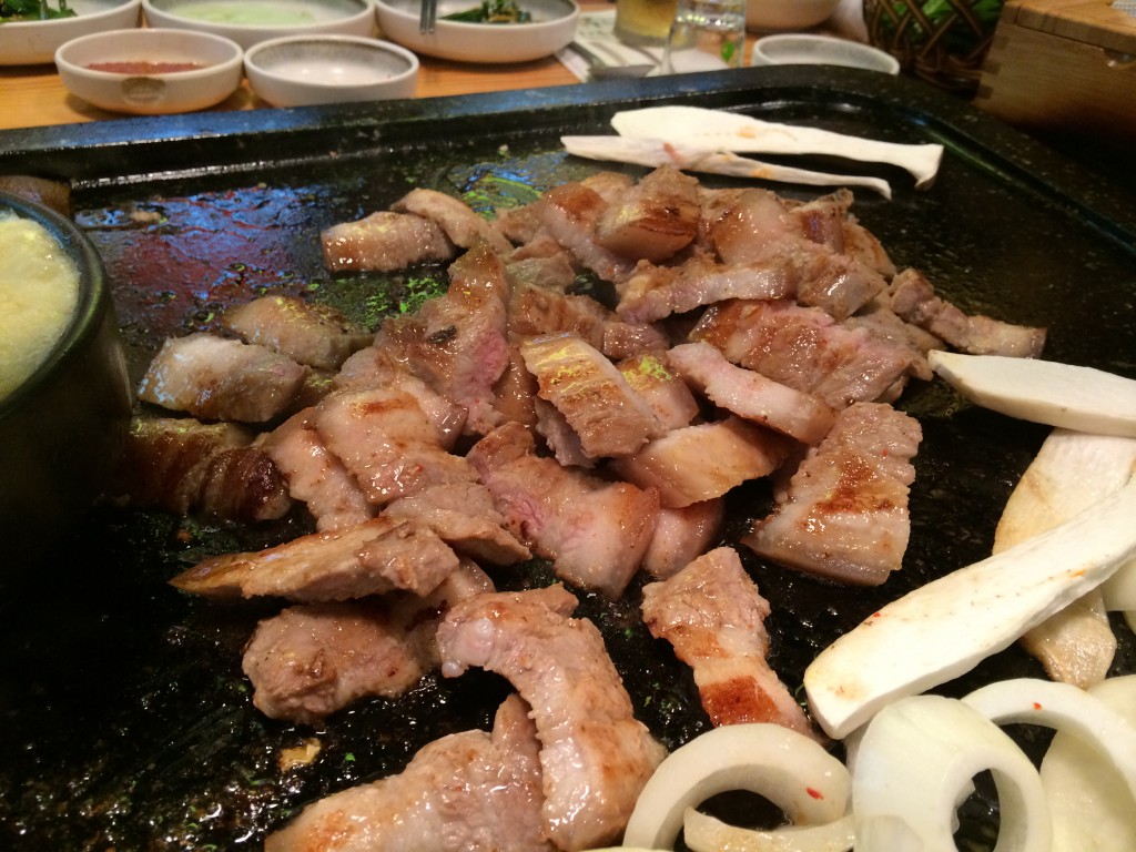 고기는 풀서비스로 다 잘라 주시네요... 돌판이라 그런지 눌러 붙지 않고 지글 지글 잘 익어갑니다. 누릇 누릇 구워지기만 할뿐 타거나 하는 일이 없어 좋네요.