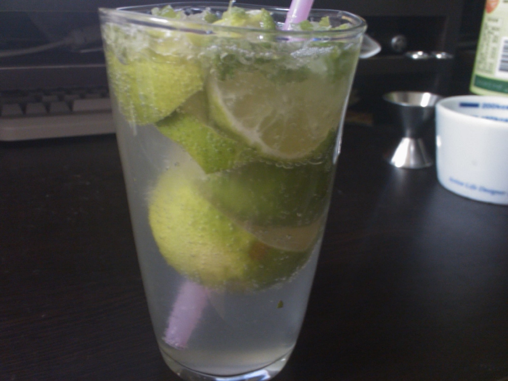 재료 : 라임 1개 ,바카디 화이트럼 40ml (소주한잔 약간 넘치게), 애플민트 잎사귀 10개 , 탄산수(사이다 )1개