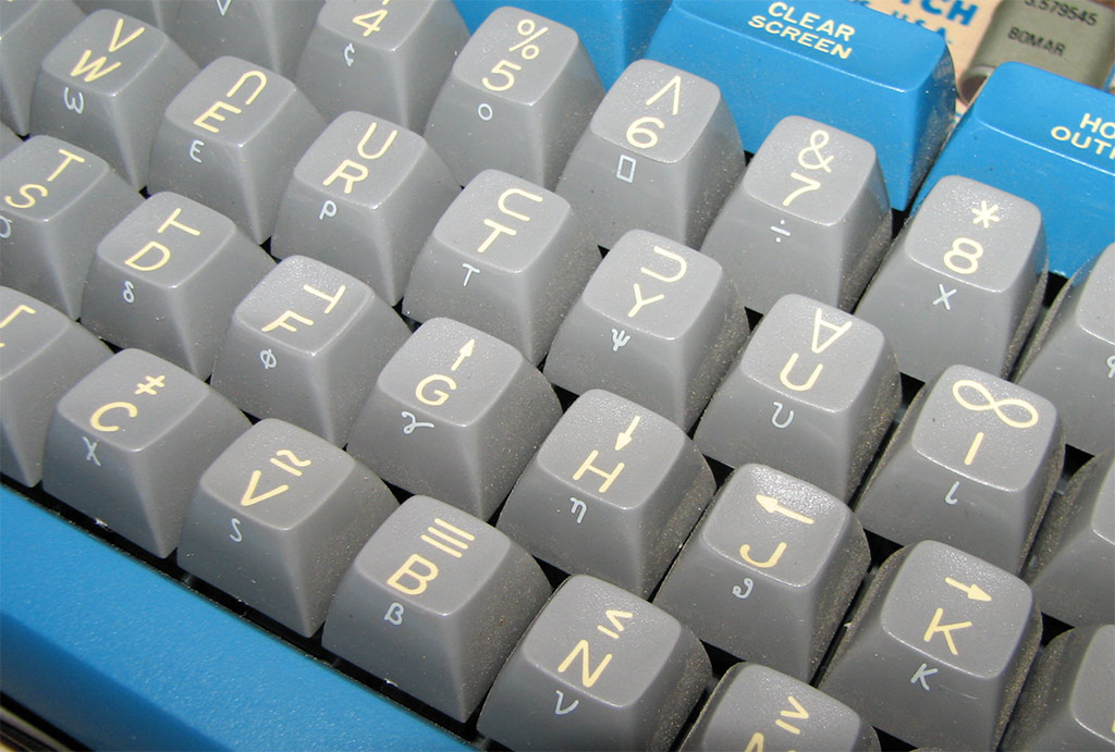 The Greek is used for mathematical notations. Apparently one can type 8000 different characters with this keyboard: